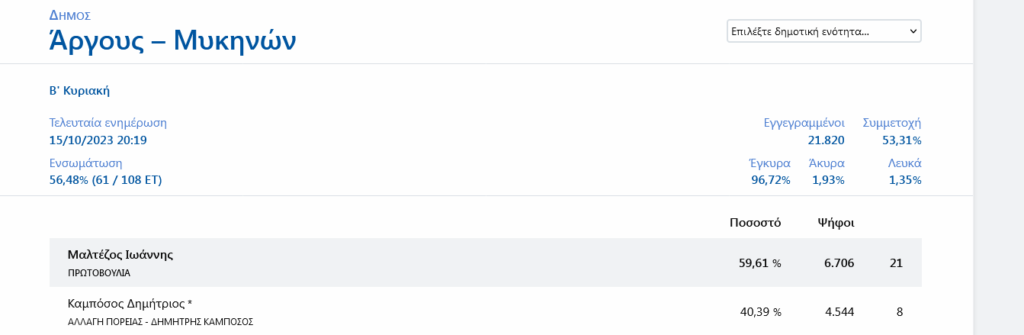 Ο Γιάννης Μαλτέζος εκλέγεται δήμαρχος Άργους-Μυκηνών 15/10/202315/10/2023 - by ΕΔΩ ΠΕΛΟΠΟΝΝΗΣΟΣ - Αφήστε ένα σχόλιο Με ποσοστό 59.61% προηγείται ο κ. Γιάννης Μαλτέζος του Δημήτρη Καμπόσου (40.39%) στον δήμο Άργους-Μυκηνών και πετυχαίνει μεγάλη νίκη. (ενσωμάτωση στο 56,48% των τμημάτων)