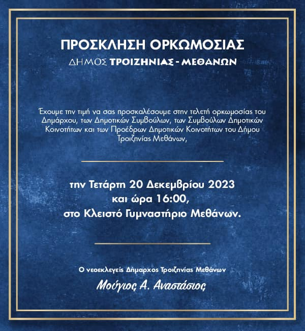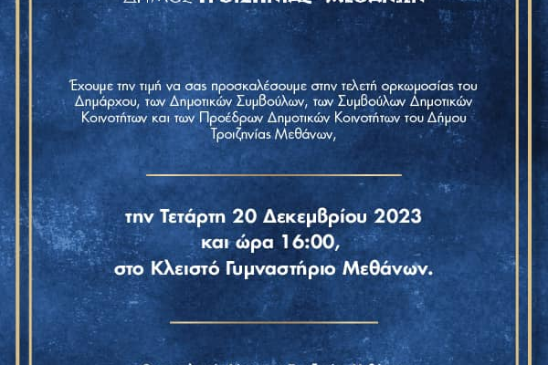 Σας προσκαλούμε στην ορκωμοσία του Δημάρχου, των Δημοτικών Συμβούλων, των Συμβούλων Δημοτικών Κοινοτήτων και των Προέδρων Δημοτικών Κοινοτήτων του Δήμου μας.