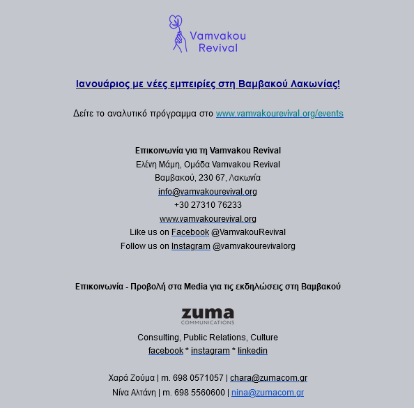 Βρείτε το αναλυτικό πρόγραμμα του μήνα στον παρακάτω σύνδεσμο: www.vamvakourevival.org/events