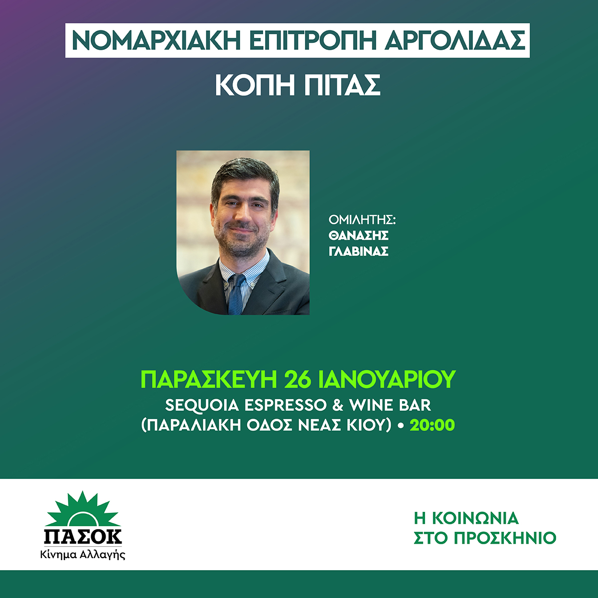Η Ν.Ε. ΠΑΣΟΚ- ΚΙΝΑΛ Αργολίδας, την Παρασκευή 26 Ιανουαρίου και ώρα 20.00, κόβει την Πρωτοχρονιάτικη Πίτα της, στη Νέα Κίο Αργολίδας, στο SEQUOIA ESPRESSO & WINE BAR, με καλεσμένο και κεντρικό ομιλητή τον Βουλευτή και Εκπρόσωπο Τύπου του ΠΑΣΟΚ, κ. Θανάση Γλαβίνα.