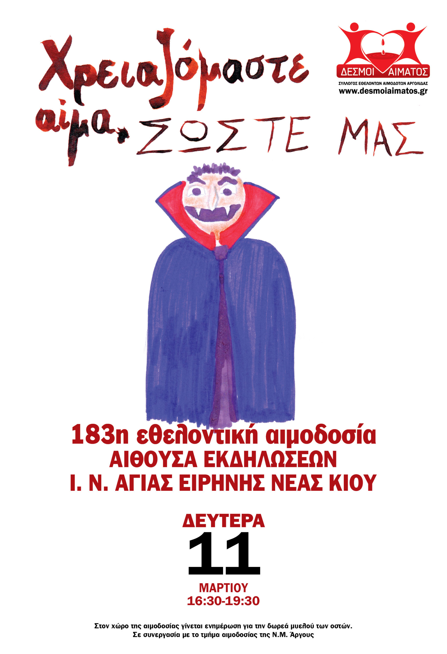 Όλοι έχουμε τη δύναμη να γίνουμε ήρωες στις καρδιές αυτών που χρειάζονται. Μια σταγόνα αίματος από εσάς μπορεί να σημαίνει μια ζωή για κάποιον άλλο. Με κάθε αιμοδοσία, δε δίνετε μόνο αίμα, αλλά ελπίδα, δύναμη και θάρρος σε όσους αγωνίζονται για τη ζωή τους.