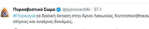 Λακωνία: Μεγάλη πυρκαγιά σε δασική έκταση στην Άρνα 29/03/202429/03/2024 - by ΕΔΩ ΠΕΛΟΠΟΝΝΗΣΟΣ - Αφήστε ένα σχόλιο Πυρκαγιά σε δασική έκταση στην Άρνα Λακωνίας εκδηλώθηκε σήμερα Παρασκευή 29 Μαρτίου περίπου στις 13:00. Σημαντική είναι η κινητοποίηση από το Πυροσβεστικό Σώμα με επίγειες και εναέριες δυνάμεις. φωτο αρχείου
