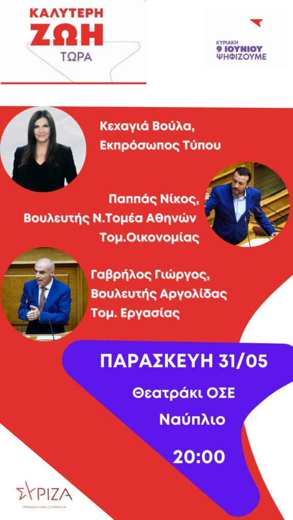 Η Νομαρχιακή Επιτροπή ΣΥΡΙΖΑ- ΠΣ καλεί τον κόσμο της Αργολίδας στην προεκλογική συγκέντρωση που θα λάβει χώρα στο Ναύπλιο, στο Θεατράκι του ΟΣΕ, την Παρασκευή 31/5 και ώρα 8μμ.