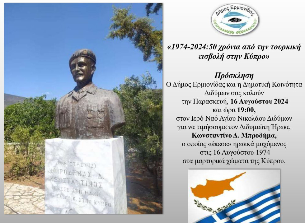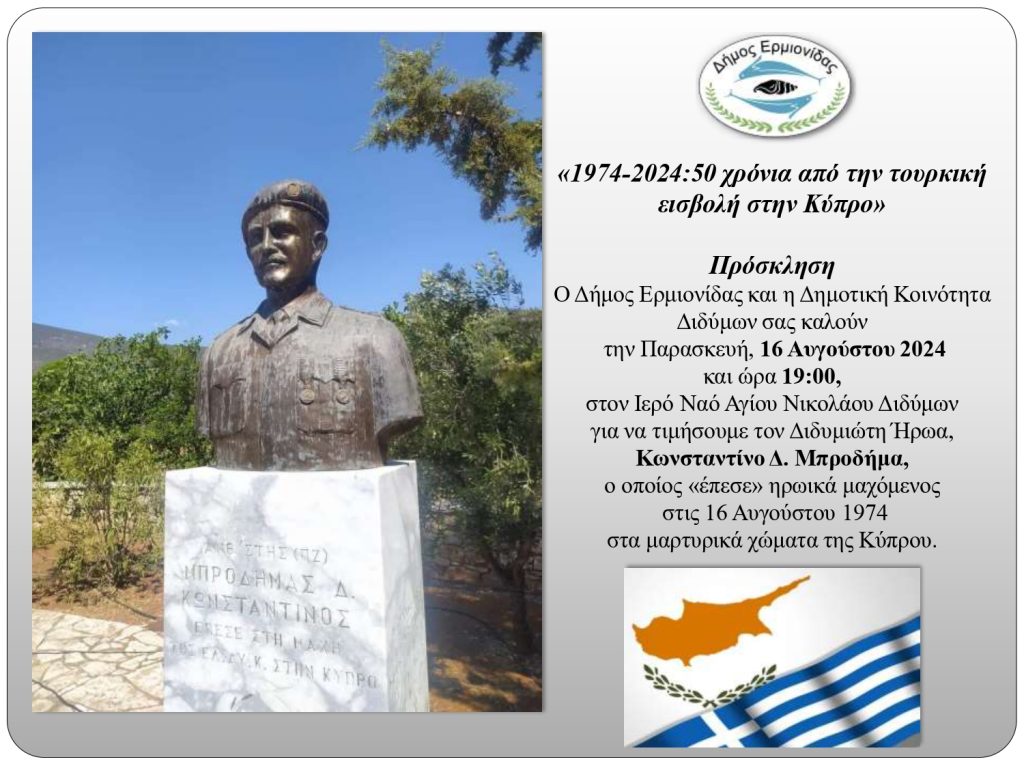 Εκδήλωση Τιμής & Μνήμης για τον Διδυμιώτη Ήρωα της ΕΛ.ΔΥ.Κ. Κωνσταντίνο Δ. Μπροδήμα 16/08/202416/08/2024 - by ΕΔΩ ΠΕΛΟΠΟΝΝΗΣΟΣ - Αφήστε ένα σχόλιο Εκδήλωση από τον Δήμο Ερμιονίδας και την Κοινότητα Διδύμων σήμερα Παρασκευή 16 Αυγούστου