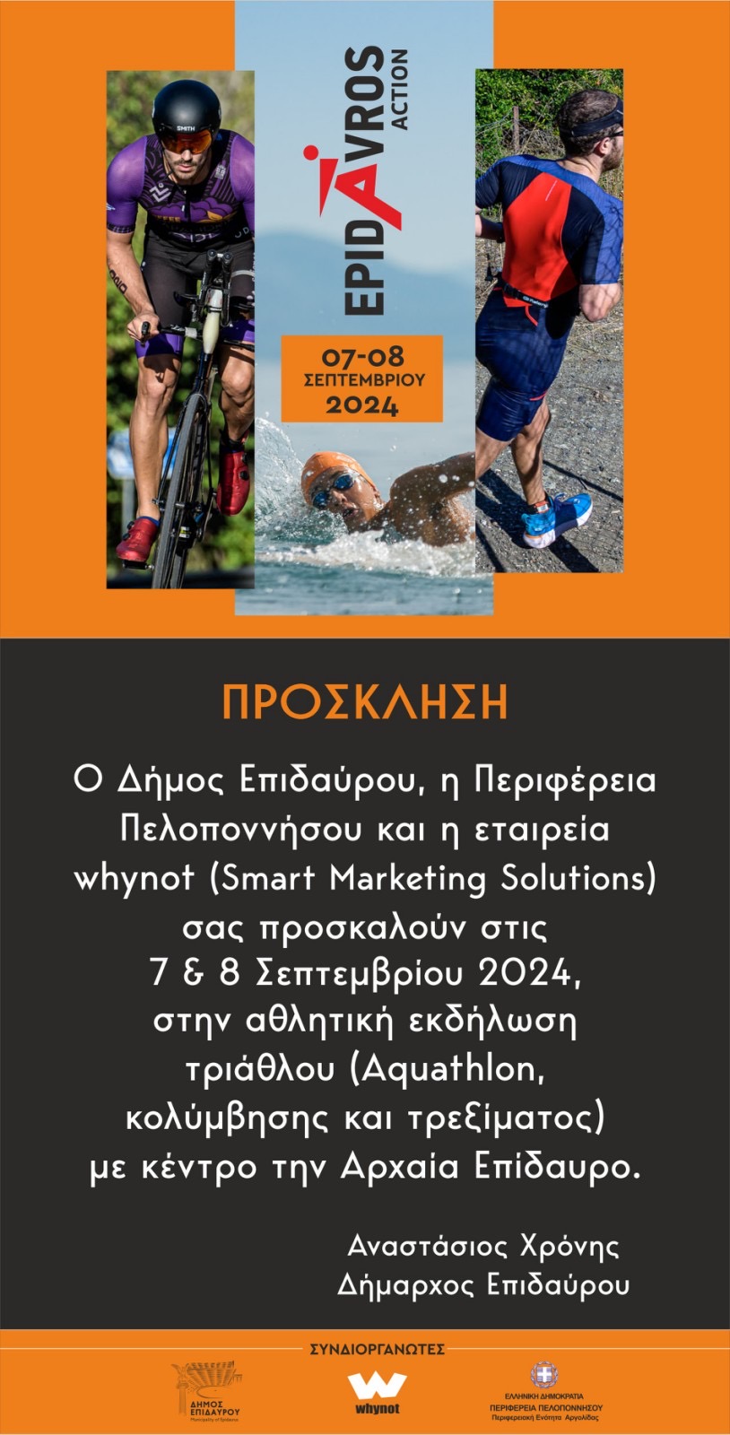 Ο Δήμος Επιδαύρου, η Περιφέρεια Πελοποννήσου και η εταιρεία whynot συνδιοργανώνουν την αθλητική εκδήλωση τριάθλου “EPIDAVROS ACTION” το Σαββατοκύριακο 7 & 8 Σεπτεμβρίου 2024.