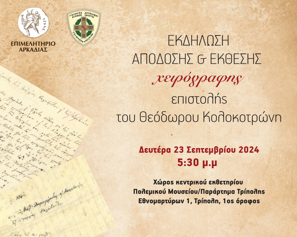 To Επιμελητήριο Αρκαδίας σε συνεργασία με το Πολεμικό Μουσείο/ Παράρτημα Τρίπολης, διοργανώνει εκδήλωση απόδοσης και έκθεσης της χειρόγραφης επιστολής του Θεόδωρου Κολοκοτρώνη, τη Δευτέρα 23 Σεπτεμβρίου 2024, και ώρα 5:30 μ.μ. στον χώρο κεντρικού εκθετηρίου του μουσείου, Εθνομαρτύρων 1, Τρίπολη, 1ος όροφος.