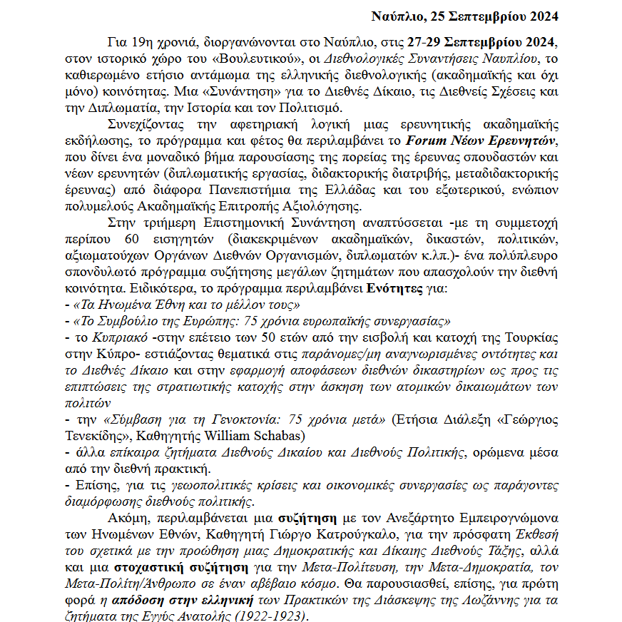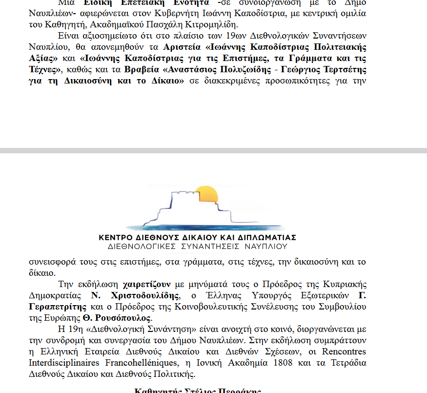 27-29 Σεπτεμβρίου για 19η χρονιά οι Διεθνολογικές Συναντήσεις στο Ναύπλιο 26/09/202426/09/2024 - by ΕΔΩ ΠΕΛΟΠΟΝΝΗΣΟΣ - Αφήστε ένα σχόλιο Καθηγητής Στέλιος Περράκης