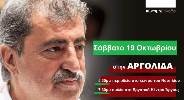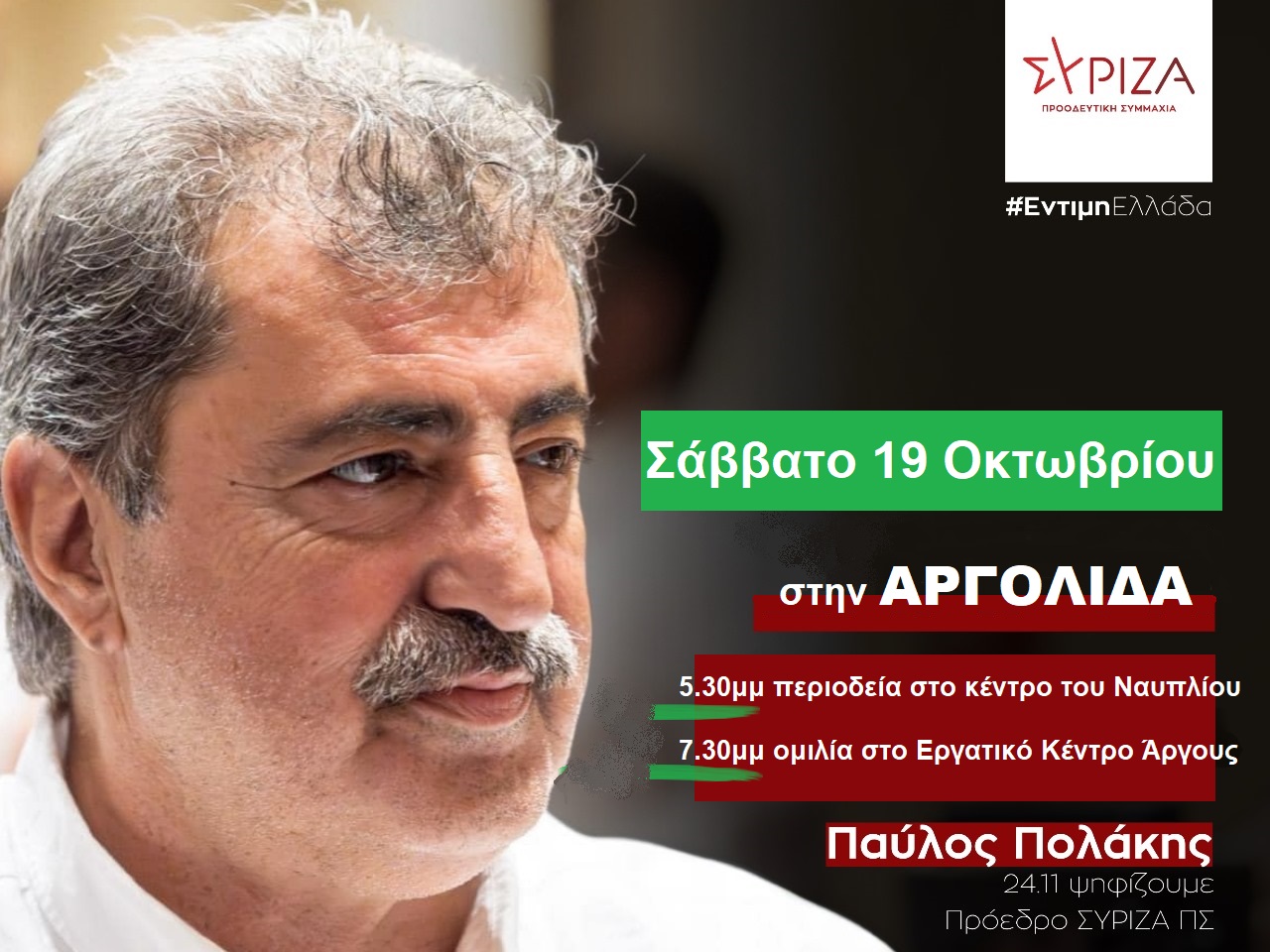 Το Σάββατο 19-10-2024 από τις 5.30μμ, ο Βουλευτής Χανίων και υποψήφιος πρόεδρος του κόμματος θα περιοδεύσει στο κέντρο του Ναυπλίου, ενώ στις 7.30μμ θα πραγματοποιήσει συγκέντρωση και ομιλία, στο Εργατικό Κέντρο Άργους, σε μέλη και φίλους του κόμματος από την Αργολίδα.