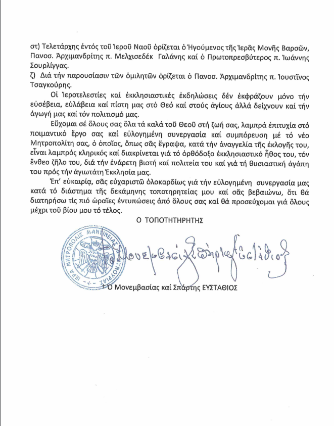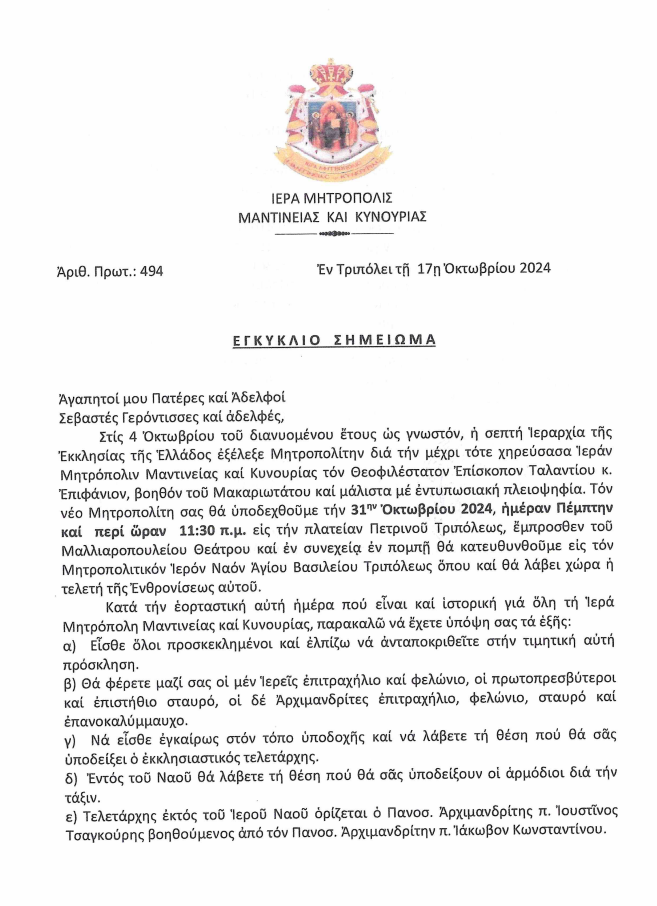 Η Ιερά Μητρόπολη Μαντινείας και Κυνουρίας ανακοινώνει την ενθρόνιση του νέου Μητροπολίτη, κ. Επιφανίου, που εξελέγη με μεγάλη πλειοψηφία από την Ιερά Σύνοδο της Εκκλησίας της Ελλάδος στις 4 Οκτωβρίου 2024.