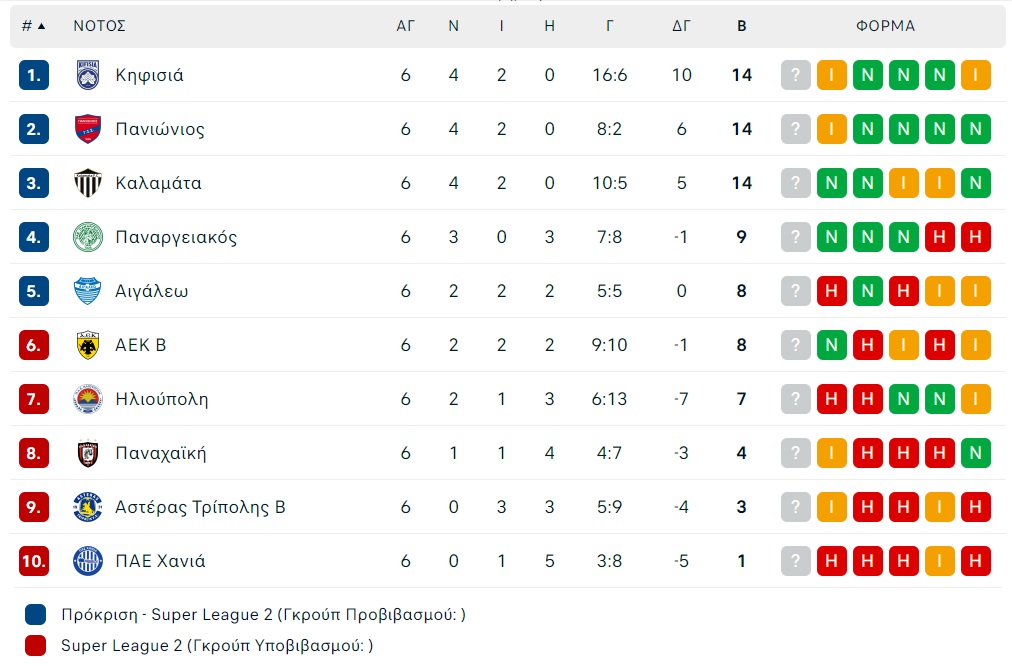 Τρεις είναι οι συγκάτοικοι στην πρώτη θέση του Β’ (Νότιου) Ομίλου της SL 2 μετά την 6η αγωνιστική. Κηφισιά, Πανιώνιος και Καλαμάτα στη θέση του οδηγού με 14 βαθμούς, στη 4η θέση της βαθμολογίας μετά τις τρεις συνεχόμενες νίκες του ο Παναργειακός με 9 βαθμούς.
