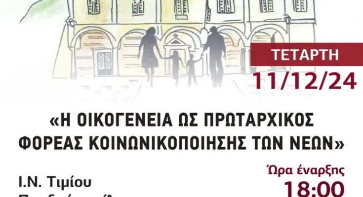 Ομιλήτρια θα είναι η κ. Εριφύλη Μπακιρλή Δρ. Εγκληματολογίας του Πάντειου Πανεπιστήμιου με θέμα: «Η οικογένεια ως πρωταρχικός φορέας κοινωνικοποίησης των νέων».