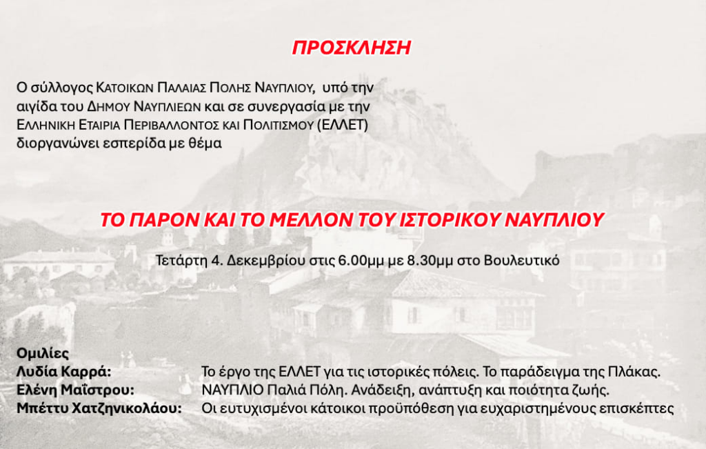“Το παρόν και το μέλλον του Ιστορικού Ναυπλίου” – Εκδήλωση στο Βουλευτικό 02/12/202402/12/2024 - by ΕΔΩ ΠΕΛΟΠΟΝΝΗΣΟΣ - Αφήστε ένα σχόλιο Εκδήλωση στο Βουλευτικό την προσεχή Τετάρτη στις 18:00