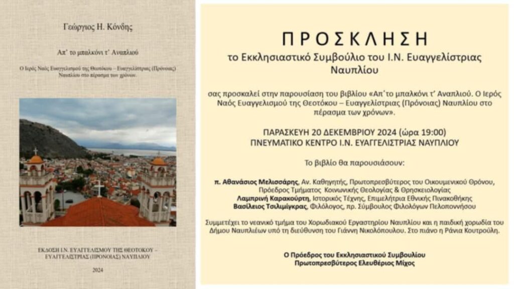 Παρουσίαση του βιβλίου “Απ’ το μπαλκόνι τ’ Αναπλιού” στον Ι.Ν. Ευαγγελίστριας Ναυπλίου 10/12/202410/12/2024 - by ΕΔΩ ΠΕΛΟΠΟΝΝΗΣΟΣ - Αφήστε ένα σχόλιο Παρουσίαση του βιβλίου του Γιώργου Κόνδη “Απ’ το μπαλκόνι τ’ Αναπλιού” την Παρασκευή 20 Δεκεμβρίου στις 19:00 στο Πνευματικό Κέντρου του Ιερού Ναού Ευαγγελίστριας Ναυπλίου.