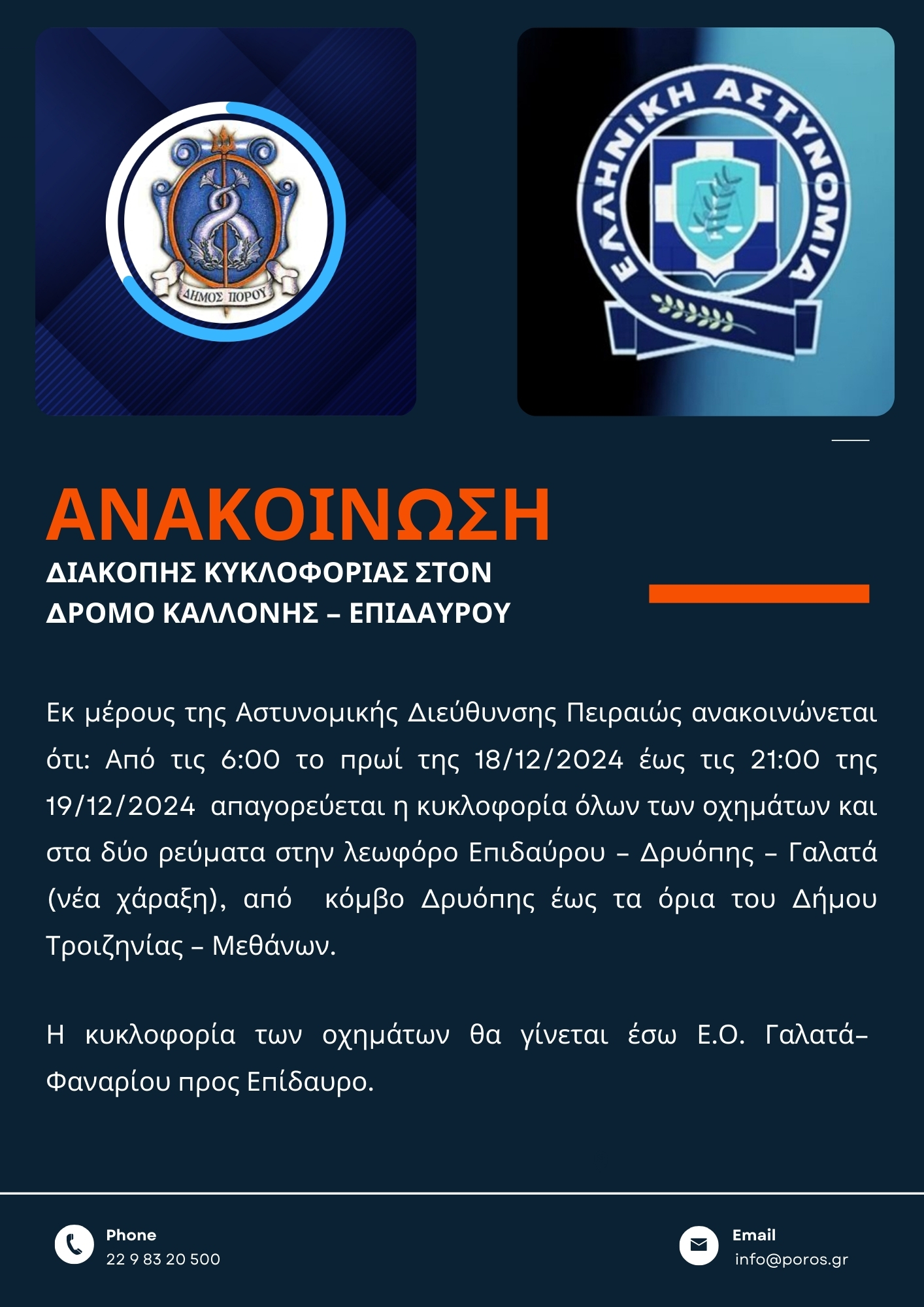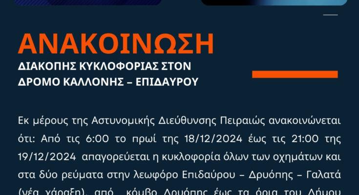 Εκ μέρους της Αστυνομικής Διεύθυνσης Πειραιώς ανακοινώνεται ότι: Από τις 6:00 το πρωί της 18/12/2024 έως τις 21:00 της 19/12/2024 απαγορεύεται η κυκλοφορία όλων των οχημάτων και στα δύο ρεύματα στην λεωφόρο Επιδαύρου – Δρυόπης – Γαλατά (νέα χάραξη), από κόμβο Δρυόπης έως τα όρια του Δήμου Τροιζηνίας – Μεθάνων.