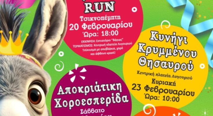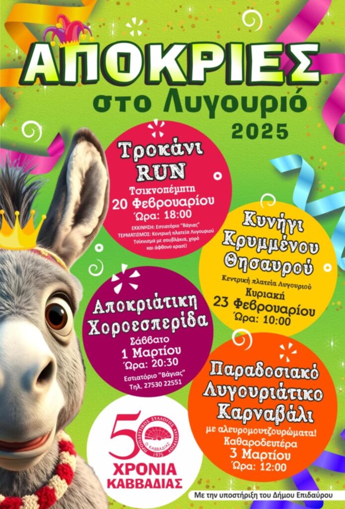 Ο παλμός των αποκριάτικων εκδηλώσεων θα χτυπήσει και πάλι στο Λυγουριό! “Ο Καββαδίας” σε συνεργασία με την Κοινότητα Ασκληπιείου του Δήμου Επιδαύρου σας προσκαλούν να γίνετε μέρος της πολύχρωμης γιορτής! Τα λαμπερά παιδικά χαμόγελα των μικρών, η ξέφρενη διάθεση των μεγάλων, η αποκριάτικη παράδοση και το κέφι, συνθέτουν ένα διασκεδαστικό γαϊτανάκι που θα ξετυλιχθεί στις γειτονιές του τόπου μας.