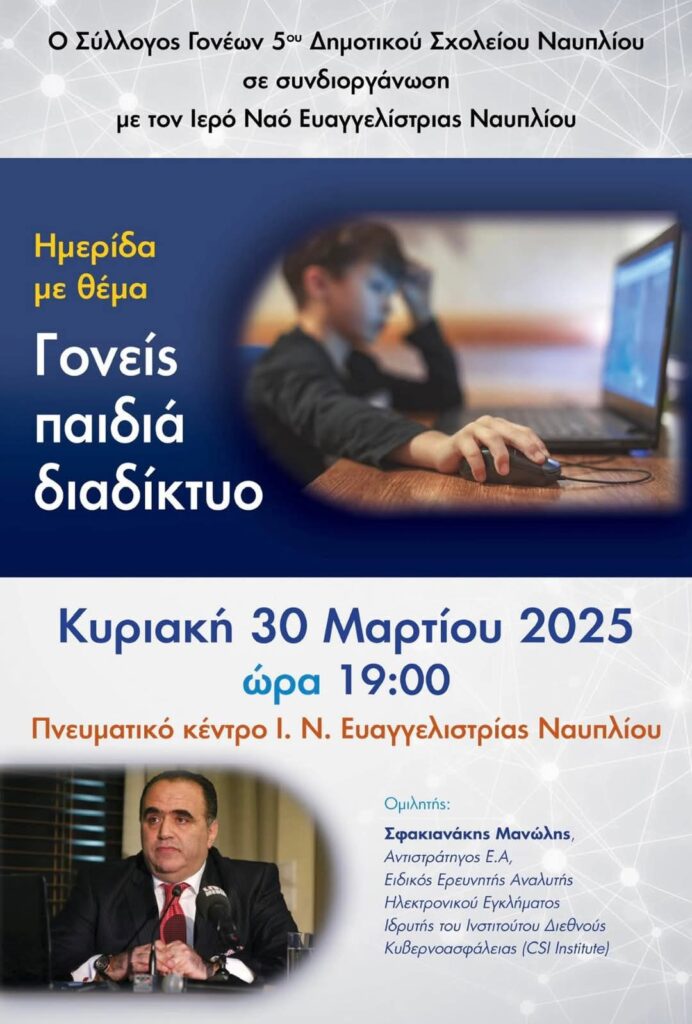 Την Κυριακή 30 Μαρτίου 2025 και ώρα 19:00 ο Σύλλογος Γονέων του 5ου Δημοτικού Ναυπλίου σε συνεργασία με τον Ιερό Ναό Ευαγγελίστριας Ναυπλίου Διοργανώνει μία ενδιαφέρουσα Ημερίδα που μας αφορά όλους!