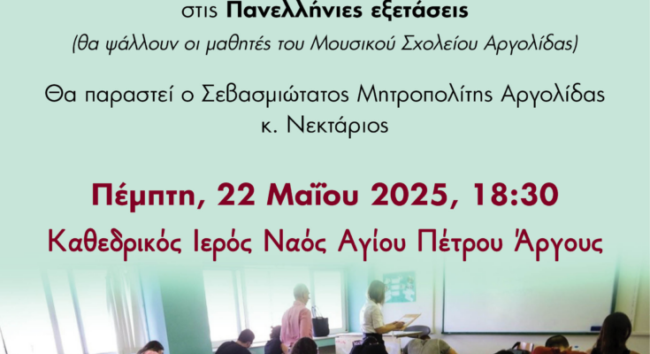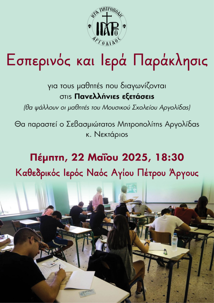 Την Πέμπτη 22 Μαϊου 2025 στις 18:30 στον Ιερό Ναό Αγίου Πέτρου Άργους ο Βυζαντινός χορός του ΜΟΥΣΙΚΟΎ ΣΧΟΛΕΊΟΥ ΑΡΓΟΛΙΔΑΣ θα συμμετάσχει στον Εσπερινό- Παράκληση που θα γίνει για όλους τους διαγωνιζόμενους των πανελλαδικών εξετάσεων. Στην τελετή θα παραστεί και ο Μητροπολίτης Αργολίδας.