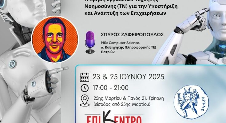 Το Επιμελητήριο Αρκαδίας σε συνεργασία με το Κ.Δ.Β.Μ. ΕΠΙΚΕΝΤΡΟ VOCATIONAL TRAINING διοργανώνει δωρεάν διήμερο εκπαιδευτικό σεμινάριο Δευτέρα 23 και Τετάρτη 25 Ιουνίου, με τίτλο: “Η Χρήση Εργαλείων Τεχνητής Νοημοσύνης (AI) για την Υποστήριξη και Ανάπτυξη των Επιχειρήσεων”, στην αίθουσα εκδηλώσεων του Επιμελητηρίου Αρκαδίας, 25ης Μαρτίου & Πανός 21, Τρίπολη (είσοδος από 25ης Μαρτίου).