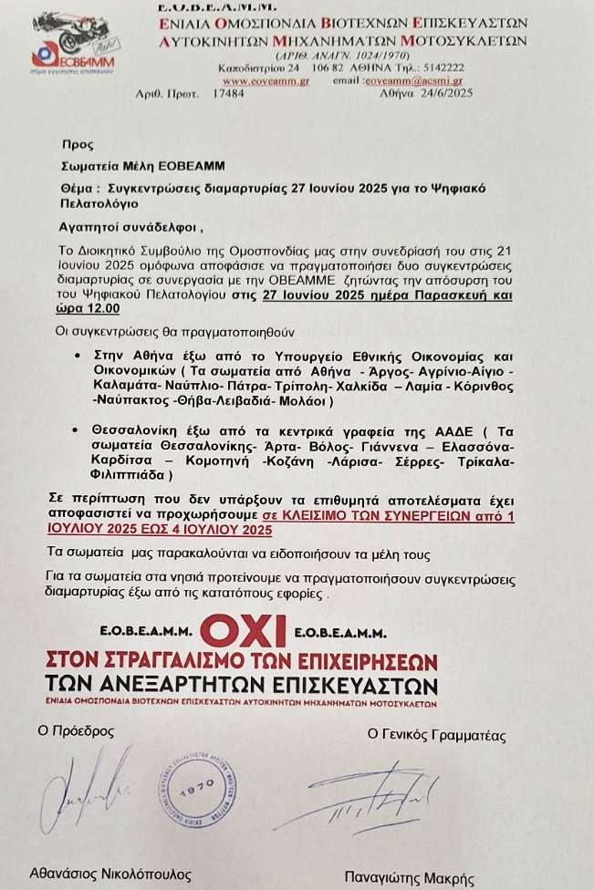 Με 24ωρες επαναλαμβανόμενες απεργίες από την 1η Ιουλίου προχωρούν οι ιδιοκτήτες συνεργείων αυτοκινήτων και μοτοσυκλετών σε όλη τη χώρα, αντιδρώντας στην υποχρεωτική εφαρμογή του ψηφιακού πελατολογίου της ΑΑΔΕ.