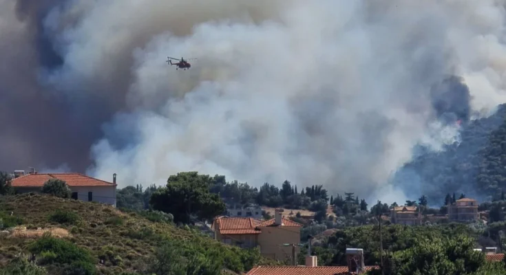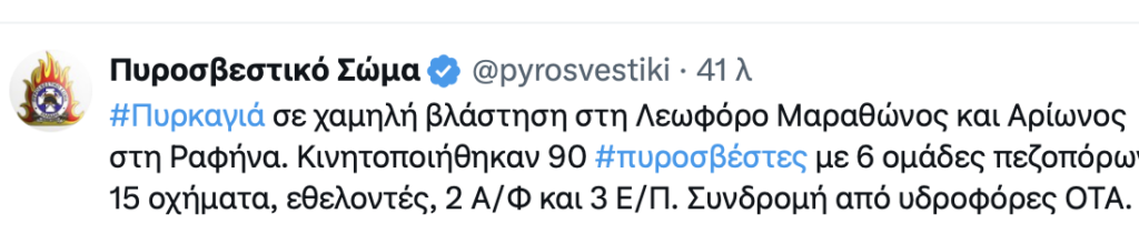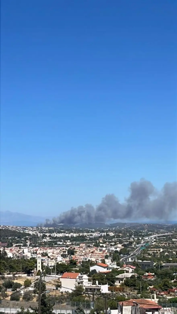 Μάλιστα, εστάλη μήνυμα από το 112 σε όσους βρίσκονται στις περιοχές Αγία Κυριακή, Έτος Στέκο και Ήμερος Πεύκος να απομακρυνθούν μέσω Αγίας Κυριακής Λεωφόρο Μαραθώνος προς γήπεδο Αρτέμιδας.