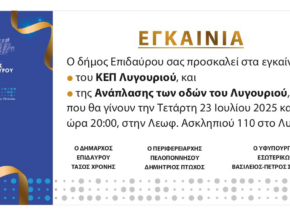 Εγκαίνια για το Κ.Ε.Π. (0152) Λυγουριού στο Δήμο Επιδαύρου την Τετάρτη 23 Ιουλίου στις 20:00 σε νέο χώρο που βρίσκεται …