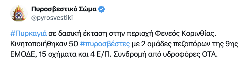 Πυρκαγιά εκδηλώθηκε σήμερα Τρίτη 22 Ιουλίου το μεσημέρι σε δασική έκταση στο Φενεό Κορινθίας, ενώ μεγάλη είναι η κινητοποίηση από το Πυροσβεστικό Σώμα με τέσσερα ελικόπτερα, 15 οχήματα και 50 πυροσβέστες.