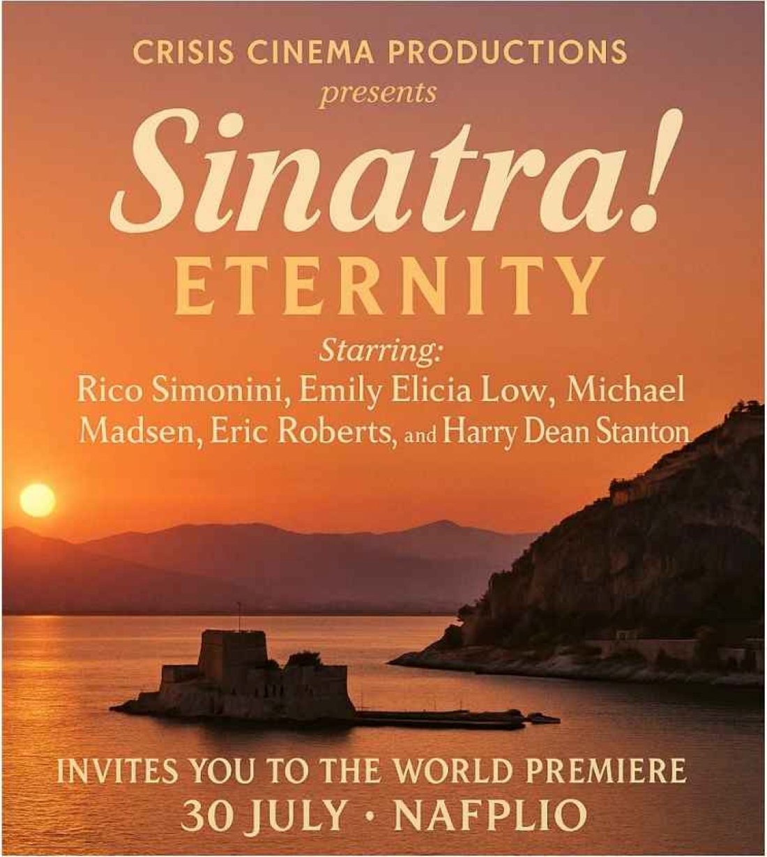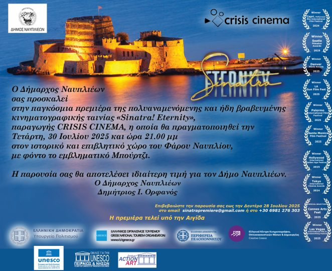 Η όμορφη και ιστορική πρωτεύουσα της Αργολίδας, φιλοξενεί την παγκόσμια πρεμιέρα της ταινίας ” Sinatra, Eternity ” σε σκηνοθεσία των Γιώργου Παπαθεοδώρου και Michael Oblowitz. Η προβολή, τελεί υπό την αιγίδα του ΕΟΤ και της Περιφέρειας Πελοποννήσου. Υποστηρίζει την εκδήλωση ο δήμος Ναυπλιέων και η παραγωγή ‘΄Σπηλιώτης Κωνσταντίνος ”. Είναι ένα γεγονός διεθνούς εμβέλειας, που αναδεικνύει το Ναύπλιο,, ως μοναδικό σκηνικό για κορυφαίες καλλιτεχνικές παραγωγές.