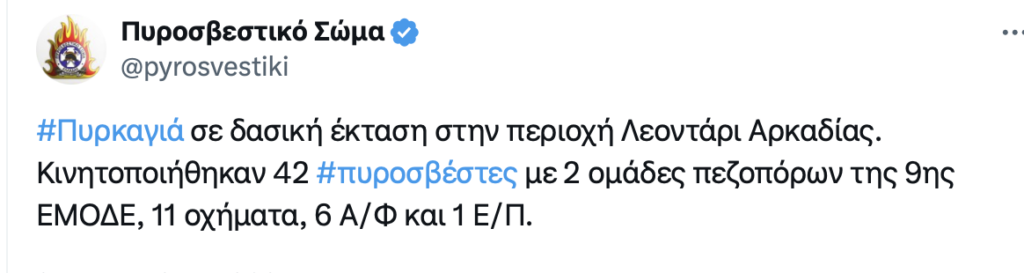 Πυρκαγιά εκδηλώθηκε σήμερα Σάββατο 9, Αυγούστου το πρωί σε δασική έκταση στην περιοχή Λεοντάρι Αρκαδίας. Έχουν κινητοποιηθεί 42 πυροσβέστες με δύο ομάδες πεζοπόρο από την 9η ΕΜΟΔΕ, 11 οχήματα έξι αεροσκάφη και δύο ελικόπτερα.