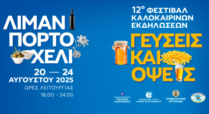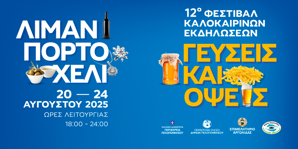 Το Επιμελητήριο Αργολίδας σε συνεργασία με την Περιφέρεια Πελοποννήσου, την Περιφερειακή Ένωση Δήμων Πελοποννήσου και τον Δήμο Ερμιονίδας ενημερώνουν τους ενδιαφερόμενους ότι για 12η συνεχή χρονιά θα πραγματοποιηθεί η Εκθεσιακή Δραστηριότητα «Γεύσεις και Όψεις 2025», από την Τετάρτη 20 Αυγούστου έως την Κυριακή 24 Αυγούστου, στο λιμάνι του Πορτοχελίου.