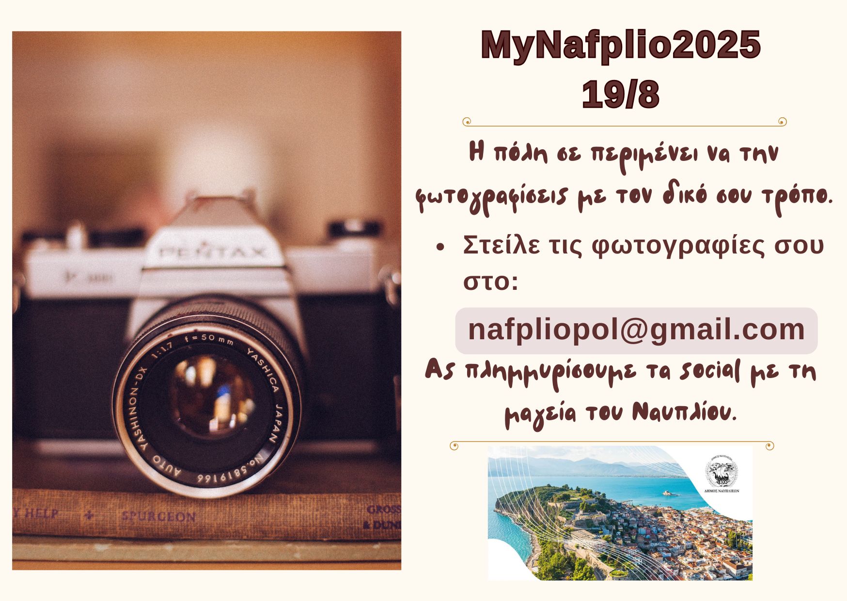 - Στείλτε έως τρεις (3) φωτογραφίες σας στο email nafpliopol@gmail.com