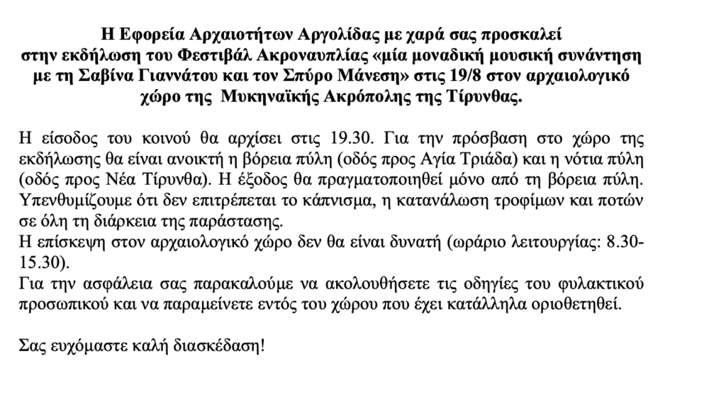Το Φεστιβάλ Ακροναυπλίας στην Ακρόπολη Τίρυνθας απόψε Τρίτη 19 Αυγούστου 19/08/202519/08/2025 - by ΕΔΩ ΠΕΛΟΠΟΝΝΗΣΟΣ - Αφήστε ένα σχόλιο Το Φεστιβάλ Ακροναυπλίας στην Ακρόπολη Τίρυνθας απόψε Τρίτη 19 Αυγούστου