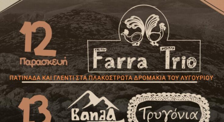 Την Παρασκευή 12 Σεπτεμβρίου, γύρω στις 8 το βράδυ, το συγκρότημα “Farra Trio ”, που στα ισπανικά σημαίνει γλέντι, θα μας ταξιδέψει περιδιαβαίνοντας τους πλακόστρωτους δρόμους του Λυγουριού με μία πατινάδα, δηλαδή τραγούδι και γλέντι στο δρόμο. Τα δύο από τα τρία μέλη του “Farra Trio” συναντήθηκαν στο νότο της Ισπανίας. Στην αρχική του σύνθεση είναι μια ζυγιά με κλαρίνο (Δάφνη) και λαούτο (Θάνος) που αγαπάει ιδιαίτερα την στεριανή δημοτική παράδοση. Όταν τα όργανα αλλάζουν χέρια μεταμορφώνεται σε μια νησιώτικη ζυγιά με βιολί (Θάνος) και λαούτο (Δάφνη) που ταξιδεύει από τις Κυκλάδες ως την Δράμα. Με την προσθήκη των κρουστών (Σταμάτης), ο ρυθμός αποκτά πρωταγωνιστικό ρόλο ενώ παράλληλα οι τρεις φωνές ανακατεύονται συνεχώς με αντιφωνίες, διφωνίες και πολυφωνίες. To “Farra Trio” αγαπάει τον χορό, τους μερακλήδες και την συμμετοχική διάθεση της παρέας, που όταν συνδυαστούν γεννιέται το γλέντι!
