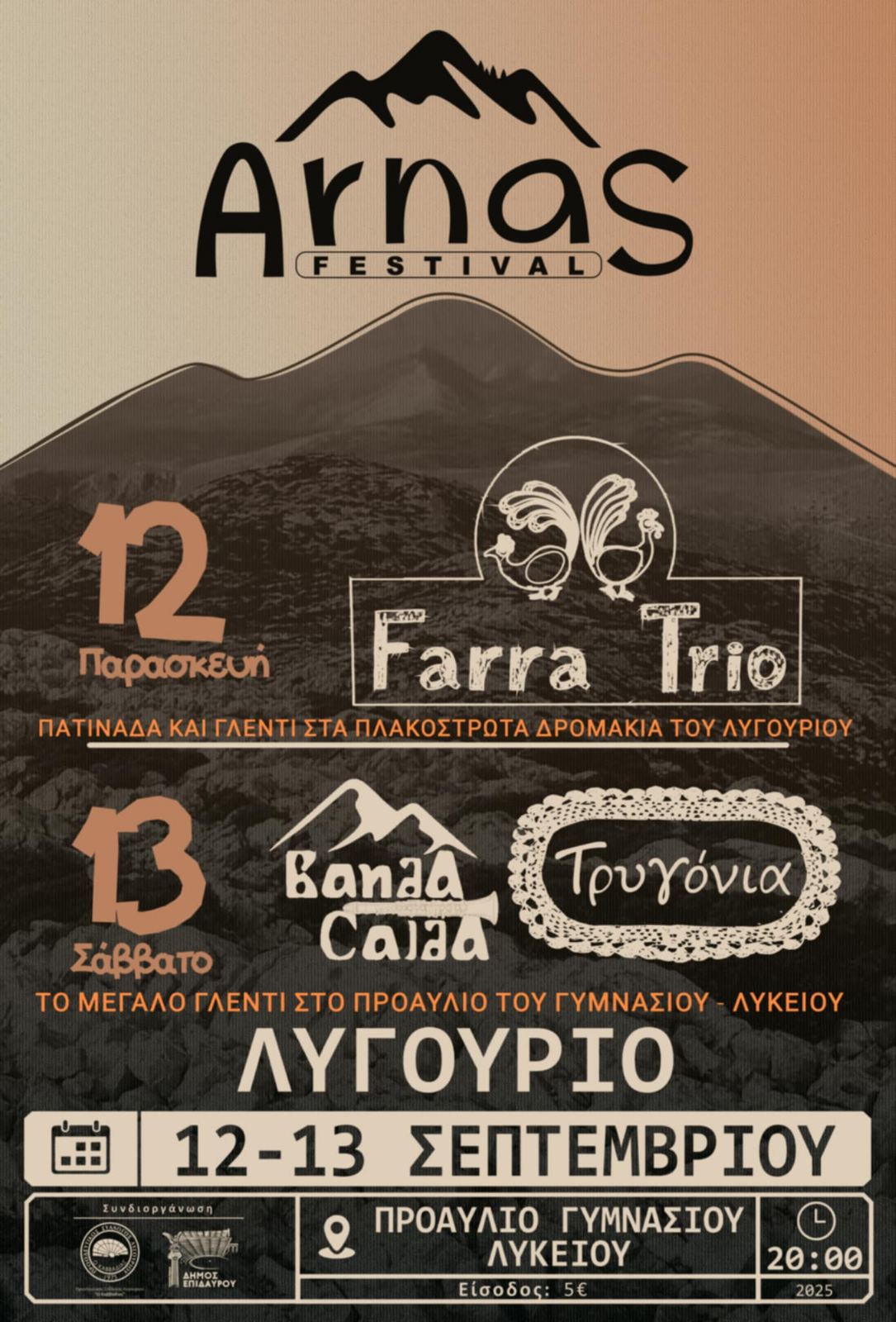 Το ταξίδι στον Αρνά συνεχίζεται φέτος τον Σεπτέμβρη, με δύο ξεχωριστές μουσικές συναντήσεις στους δρόμους του παραδοσιακού οικισμού του Λυγουριού και στο προαύλιο του Γυμνασίου – Λυκείου αντίστοιχα! Έτσι, το διήμερο 12-13 Σεπτεμβρίου, ο Προοδευτικός Σύλλογος Λυγουριού ”Ο Καββαδίας” και ο Δήμος Επιδαύρου ενώνουν και πάλι δυνάμεις και υποδέχονται τρία νέα μουσικά σχήματα, που πλέον η φήμη τους έχει ξεπεράσει τα σύνορα της Ελλάδας.