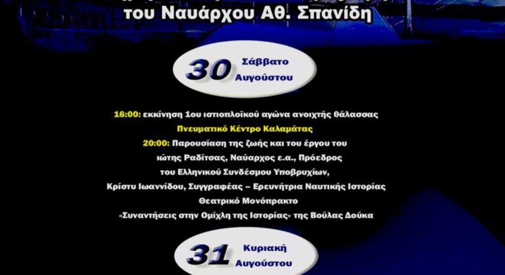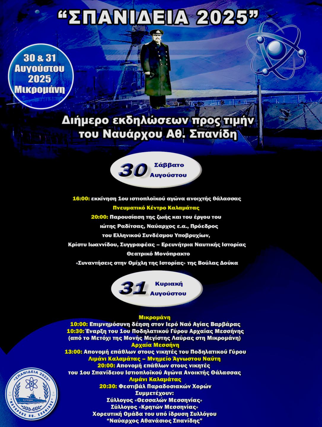 Διήμερο τιμητικών εκδηλώσεων αφιερωμένων στη μνήμη του ναυάρχου Αθανάσιου Σπανίδη θα πραγματοποιηθεί στις 30 και 31 Αυγούστου 2025, σε Καλαμάτα και Μικρομάνη.