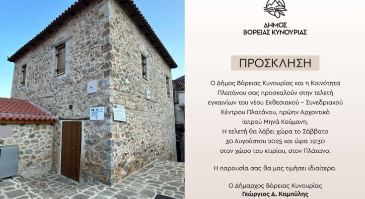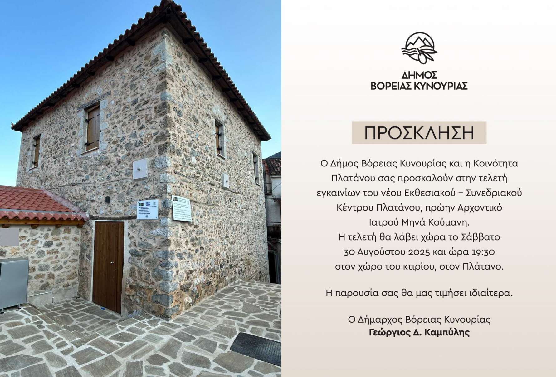 Ο Δήμος Βόρειας Κυνουρίας και η Κοινότητα Πλατάνου σας προσκαλούν στην τελετή εγκαινίων του νέου Εκθεσιακού – Συνεδριακού Κέντρου Πλατάνου, πρώην Αρχοντικό Ιατρού Μηνά Κούμανη.