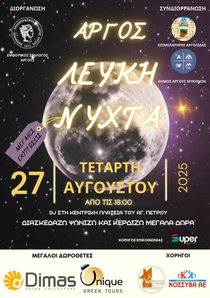 Ο Δήμος Άργους – Μυκηνών, σε συνεργασία με τον Εμπορικό Σύλλογο Άργους και το Επιμελητήριο Αργολίδας, συνδιοργανώνει και φέτος τη μεγάλη γιορτή της αγοράς, τη «Λευκή Νύχτα» στην πόλη του Άργους.