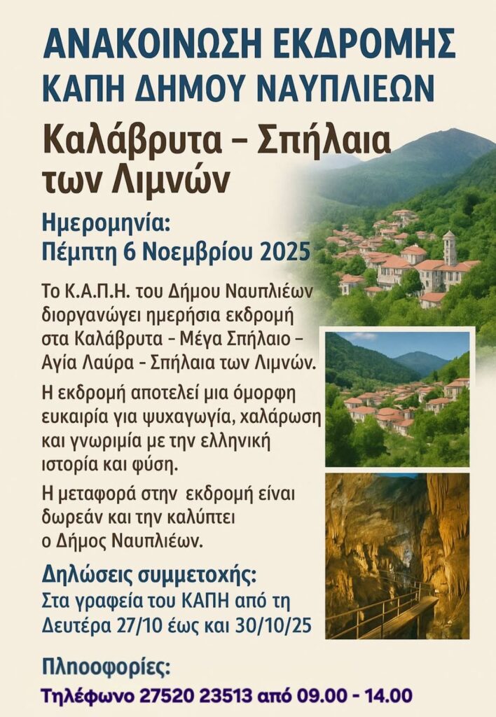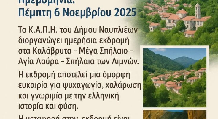 Το Κ.Α.Π.Η. του Δήμου Ναυπλιέων διοργανώνει ημερήσια εκδρομή στα Καλάβρυτα – Μέγα