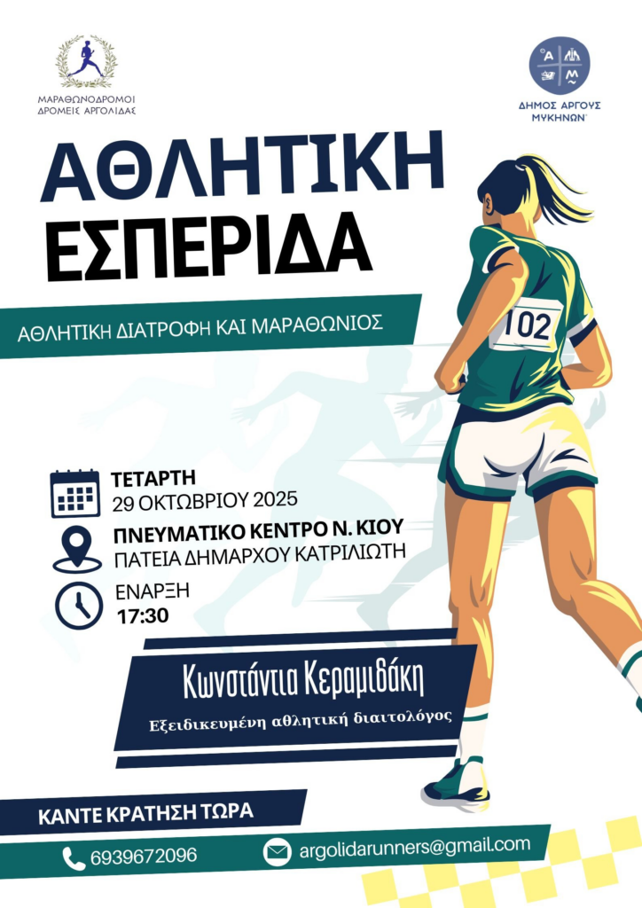 Στα πλαίσια του Αυθεντικού Μαραθωνίου της Αθήνας, ο Σύλλογος Μαραθωνοδρόμων & Δρομέων Αργολίδας, σε συνεργασία με την Κεραμιδάκη Κωνσταντία, εξειδικευμένη αθλητική διαιτολόγο, διοργανώνει ομιλία με θέμα:
