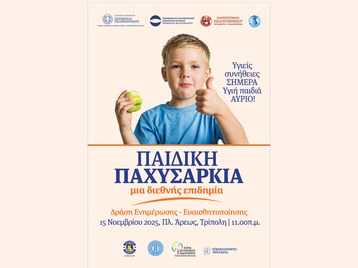 Η Γενική Διεύθυνση Δημόσιας Υγείας & Κοινωνικής Μέριμνας σε συνεργασία με τον Δήμο Τρίπολης, το Πανεπιστήμιο Πελοποννήσου, την ΠΑΕ Αστέρας Τρίπολης, το Επιμελητήριο Αρκαδίας, τον Πανελλήνιο Σύλλογο Διαιτολόγων-Διατροφολόγων και το Σώμα Ελληνικού Οδηγισμού, σας προσκαλεί στην δράση ευαισθητοποίησης με θέμα: Υγιείς Συνήθειες ΣΗΜΕΡΑ, Υγιή παιδιά ΑΥΡΙΟ!