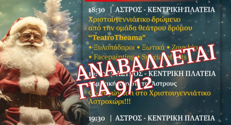 Σας γνωρίζουμε ότι η προγραμματισμένη για σήμερα φωταγώγηση του Χριστουγεννιάτικου δέντρου στην κεντρική πλατεία του Άστρους, αναβάλλεται λόγω των καιρικών φαινομένων που έχουν ανακοινωθεί από την Εθνική Μετεωρολογική Υπηρεσία.