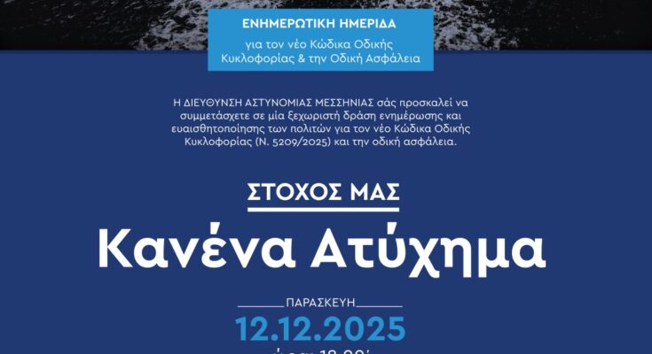Ενημερωτική ημερίδα για τον νέο Κώδικα Οδικής Κυκλοφορίας και την Οδική Ασφάλεια με τίτλο «Στόχος μας… κανένα ατύχημα» διοργανώνει η Διεύθυνση Αστυνομίας Μεσσηνίας υπό την αιγίδα του Δήμου Καλαμάτας και του οικείου Δικηγορικού Συλλόγου.