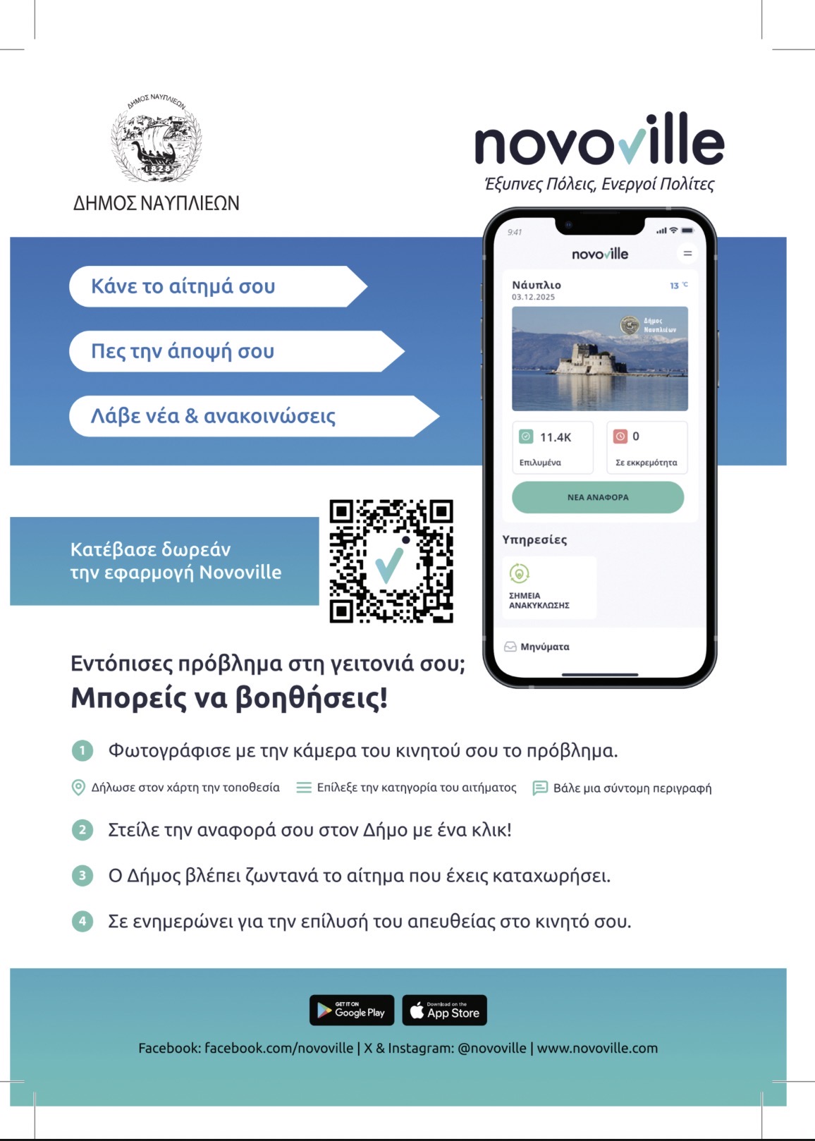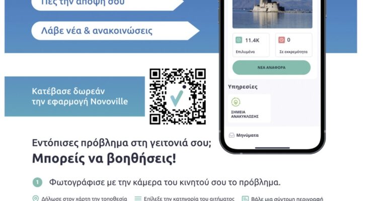 Η εφαρμογή Novoville, διαθέσιμη δωρεάν για συσκευές Android και iOS, δίνει τη δυνατότητα στους δημότες να υποβάλλουν εύκολα και γρήγορα αιτήματα καθημερινότητας, να παρακολουθούν σε πραγματικό χρόνο την πορεία επίλυσής τους, να καταθέτουν την άποψή τους, καθώς και να ενημερώνονται άμεσα για σημαντικά ζητήματα που αφορούν την πόλη.