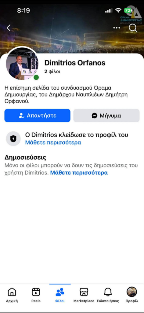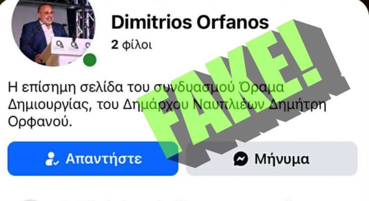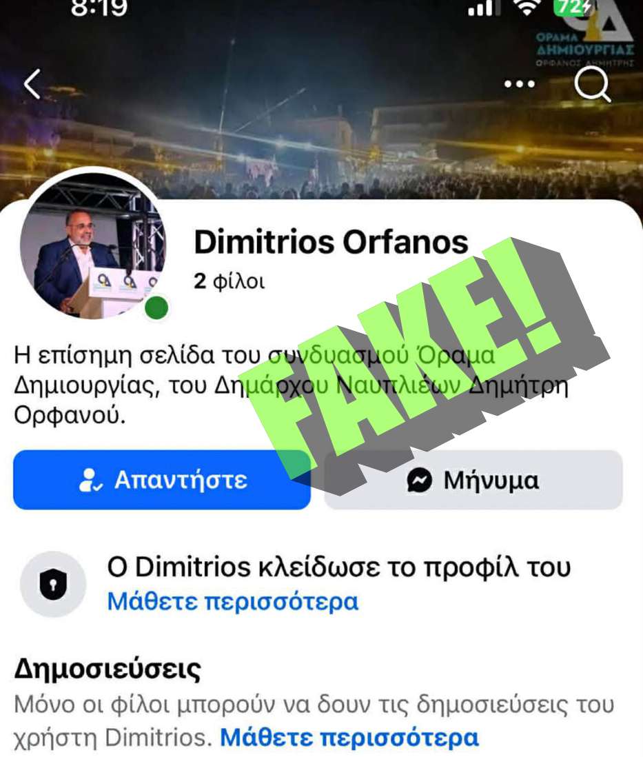 Ενημερώνω τους δημότες και όλους τους φίλους μου, ότι κυκλοφορεί ψεύτικο προφίλ στα μέσα κοινωνικής δικτύωσης, το οποίο χρησιμοποιεί τα προσωπικά μου στοιχεία και εμφανίζεται ως Δήμαρχος Ναυπλιεων και διαχειριστής της επίσημης σελίδας του συνδυασμού Όραμα Δημιουργίας.