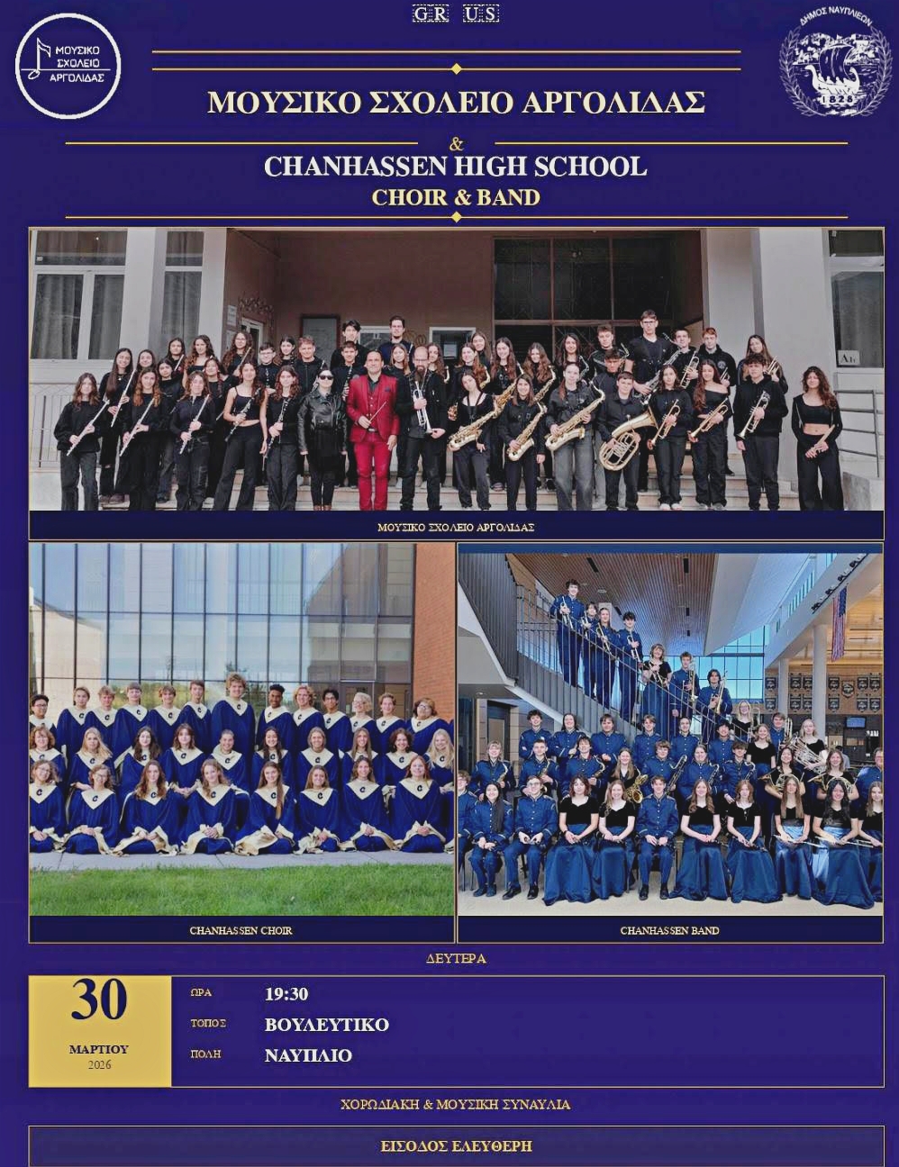 Το Μουσικό Σχολείο Αργολίδας έχει τη χαρά και την τιμή να σας προσκαλέσει σε μια ξεχωριστή μουσική βραδιά σε συνεργασία με το Chanhassen High School (Choir & Band) από τις Ηνωμένες Πολιτείες τη Δευτέρα 30 Μαρτίου στις 19:30 στην αίθουσα του Βουλευτικού στο Ναύπλιο.